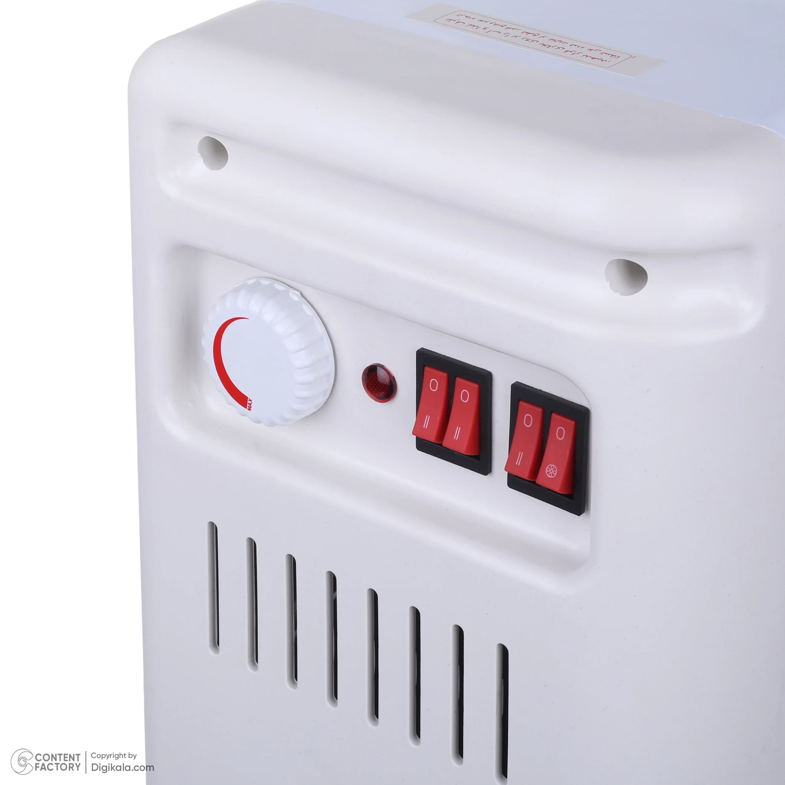 دستگاه دارای کلید تنظیم حرارت در دو سطح (کم و زیاد) است تا کاربر بتواند میزان گرمایش را متناسب با نیاز خود تنظیم کند. همچنین مجهز به ترموستات ایمنی است که در صورت افزایش بیشازحد دمای بدنه یا افتادن دستگاه، جریان برق را بهطور خودکار قطع میکند تا از خطرات احتمالی جلوگیری شود.